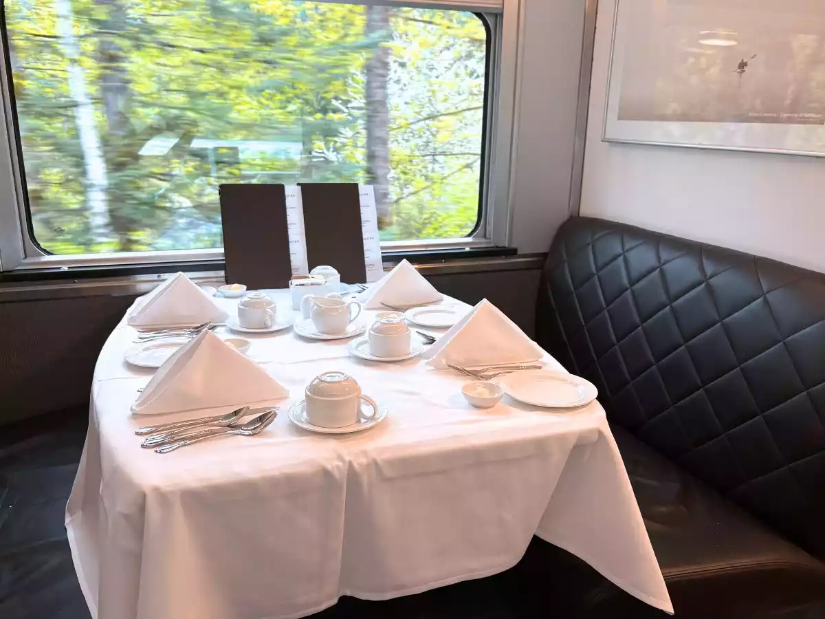 So, like any good classical rail vacation should have, Prestige Class passengers enjoy multi-course meals in one of the train's dedicated dining cars. You'll be seated in groups of four at restaurant-style, white-linen-topped tables, and, while seating groups might rotate, you will dine in the same car each night.